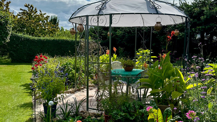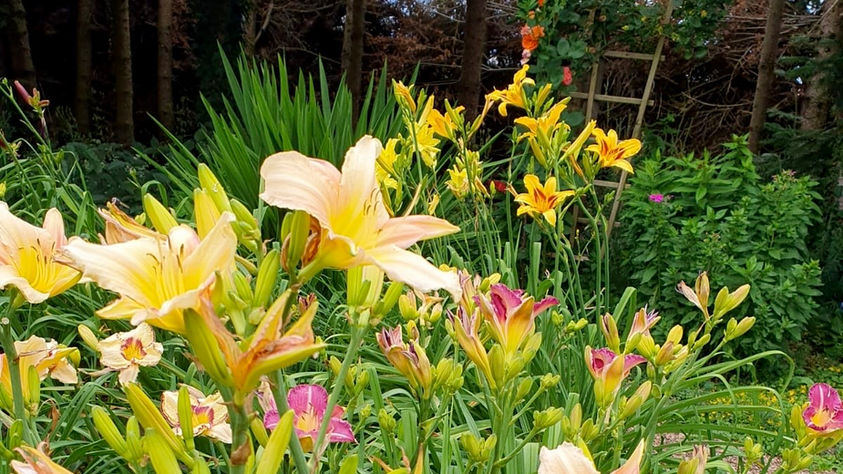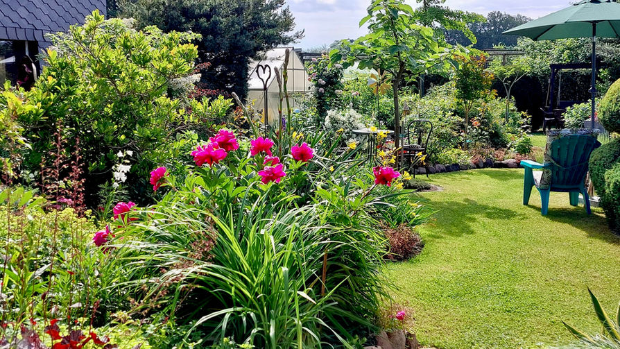 Den SOMMERGARTEN gestalten vorrangig unsere gemischten Rabatten mit ganz vielen Stauden und Sommerblumen. Über 100 verschieden blühende Taglilien, einem Feuerwerk ähnlich,leuchten durch den Garten. Bodendecker, Gräser, Sonnenhüte, Phlox, Funkien, Purpurglöckchen, Wiesenrauten u.v. m. runden den Gesamteindruck ab. Sehr strukturbestimmende und z. T. jahrzehntealte Gehölze, wie z. B. der amerikanische Tulpenbaum, Trompetenbaum, Ahorne, Korea-,Hemlok-, und Schirmtanne, blaue Mädchenkiefer, Lebensbäume, Wacholder, Zypressen, Eiben, Mahonie , Seidenbaum , Indianerflieder, Magnolien, Erikastrauch, Blumenhartriegel,Blauglockenbaum, Gingko, Goldulme, Amberbaum, Roter Holunder, Blasenspiere, Korkflügelstrauch, Hartriegel, Zungenschneeball, Gewürzstrauch, Weigelie, Deutzie u. a. sorgen das Jahr über für Abwechslung und Aufmerksamkeit. Mehrere Sorten Hortensien versprühen jedes Jahr neu ihren Charme, blühen wochen- und monatelang. Die Königin des Gartens, die Rose, fehlt natürlich auch nicht. Sie ist integriert in Rabatten, steht auch solitär,und ist Rankelpflanze an Gehölzen. Zuverlässig , meistens remontierend, blühen sie die ganze Saison über. Farbintensive Sommerblüher, wie Mittagsgold, Geranien, Buntnesseln, Salvien, Rittersporne, Sukkulenten, Kakteen, Schwertlilien und viele mehr sorgen für einen Augenschmaus. Eine große Auswahl an Topf- und Kübelpflanzen ist eine willkommende abwechselungsreiche Ergänzung unseres Pflanzenbestandes. Oleander, Hibiskus, Wüstenrose, Bougainvillen, Oliven, Zitrone, Puderquastenstrauch, Ingwer, Agapanthus, Agnistus, Kamelien, Strelizie, Ananasguave, Echeverien u. a. bilden eine ansprechende Mischung.